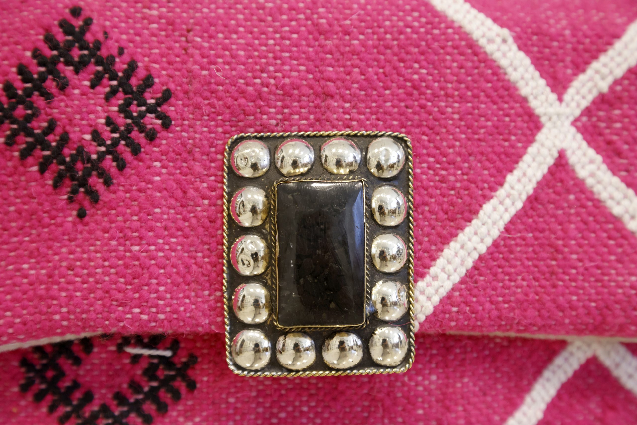 Este bolso hecho a mano en Marruecos es una verdadera obra de arte, con trozos de alfombra Bereber en un vibrante color rosa. El cierre joya étnica plateada y negra le brinda un toque elegante y único. Además, cuenta con una cadena extraíble que te permite llevarlo de diferentes formas, ya sea como un bolso de mano o colgado del hombro. Perfecto para agregar un toque de estilo y originalidad a cualquier outfit.