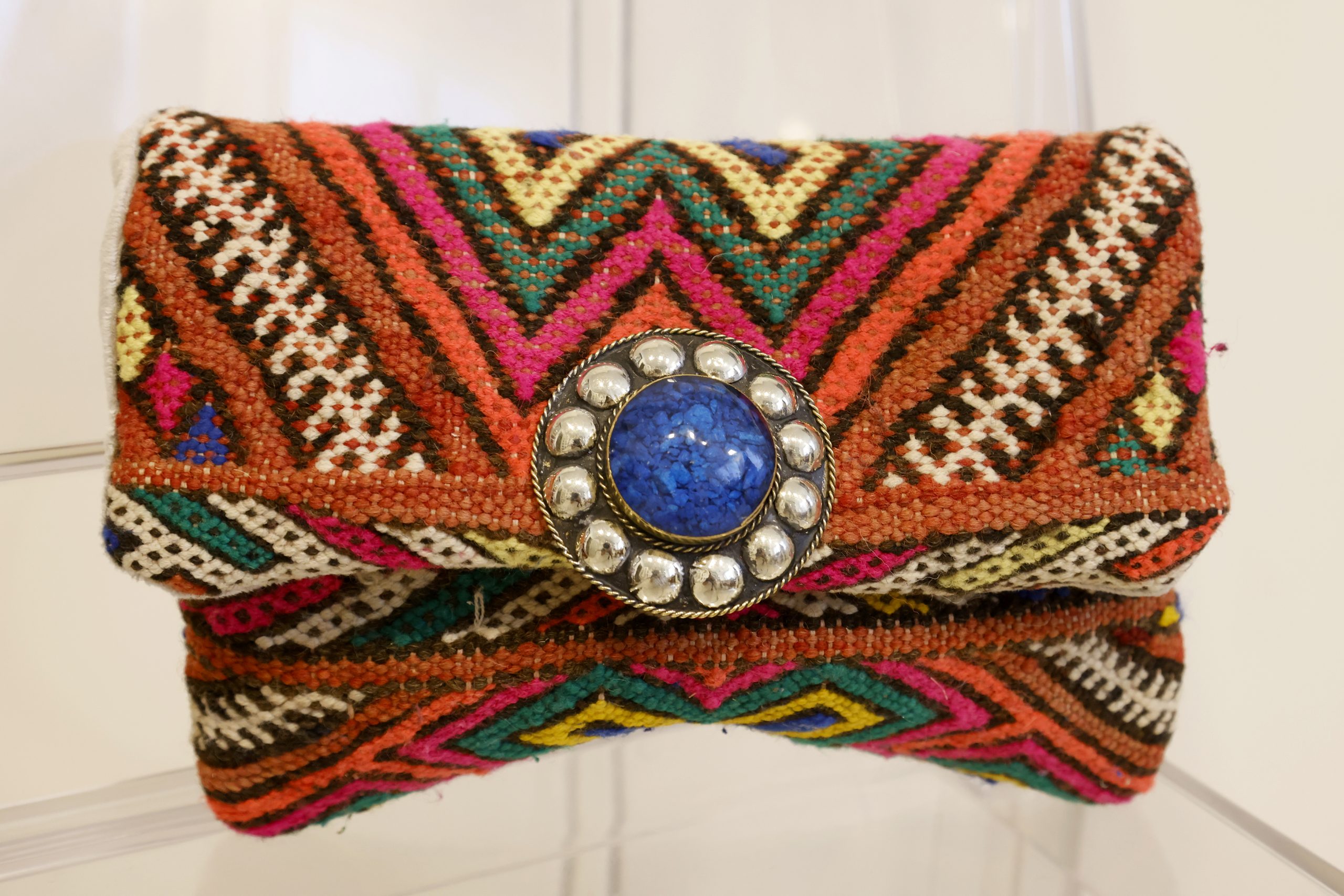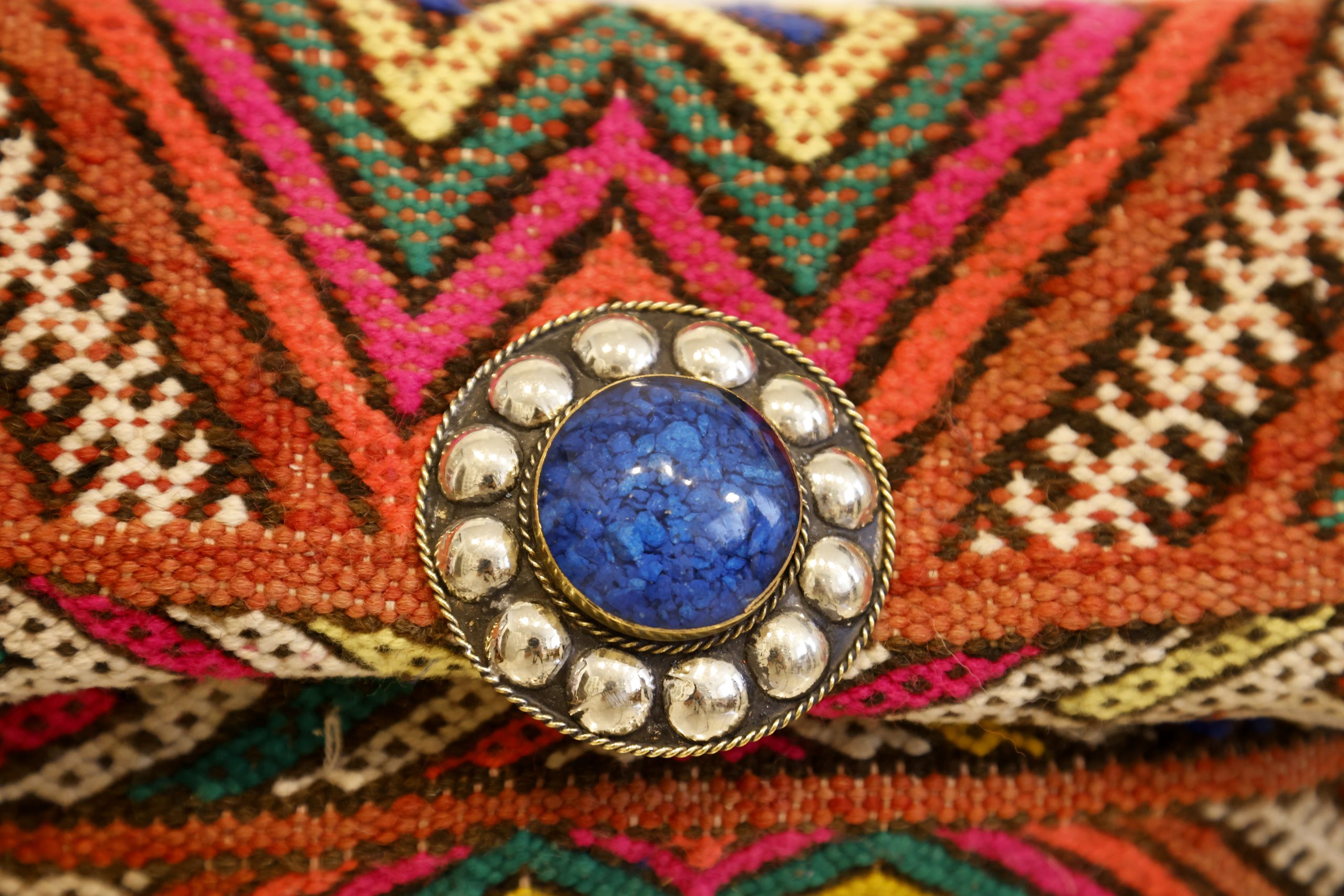 Este bolso hecho a mano en Marruecos es una verdadera obra de arte, con trozos de alfombra Bereber. El cierre joya étnica plateada y azul le brinda un toque elegante y único. Además, cuenta con una cadena extraíble que te permite llevarlo de diferentes formas, ya sea como un bolso de mano o colgado del hombro.
